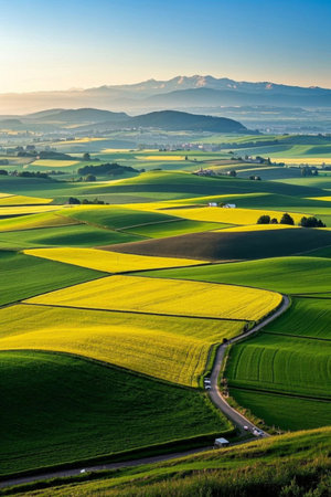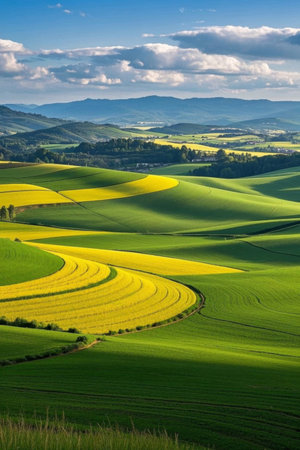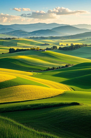 Rural landscape with green fields and waves, abstract natural background with yellow rapeseed plants