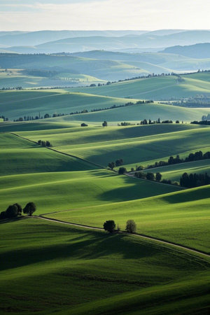 Winding road through rolling, verdant hills with varied crop lands. Sunlight and shadow play