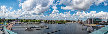 Amsterdam, Netherlands - August 1, 2016: Cityscape of Amsterdan a blue sky day with pretty white clouds from Nemo Science Museum