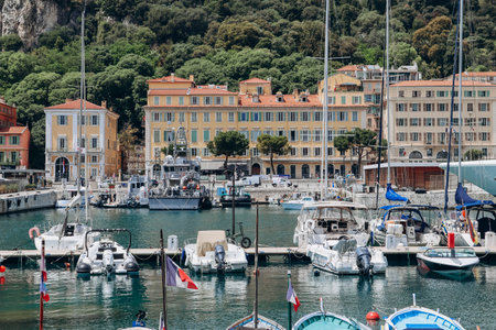 Nice, France - 01 June 2023: View of the port of Nice, moored yachts and boats, and the brightly colored facades of the surrounding houses