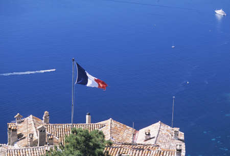 Scenic view from top to Mediterranean sea and part of Eze village. Medieval houses with France flag and green mountains in a foggy day of a French Riviera
