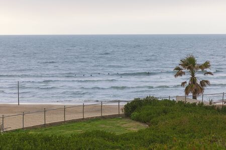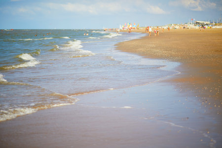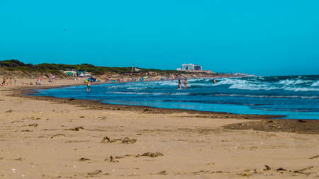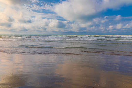 Sea shore in clear windy weather with sandy shore and waves.