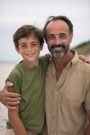 portrait of a boy and his father at the beach, created with generative ai