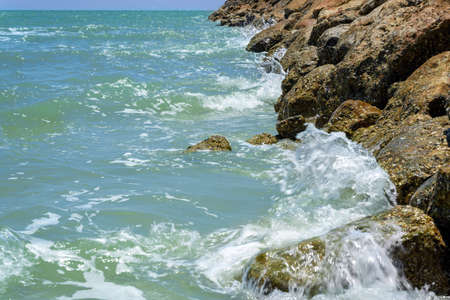 closeup waves of sea water hitting the breakwater made from the stones