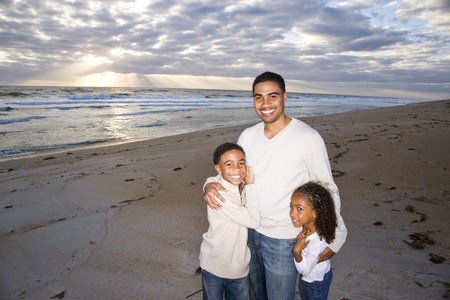 Happy African-American father, ten year old son and six year old daughter standing on beach