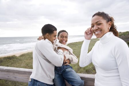 Happy African-American parents with ten year old boy laughing at beach