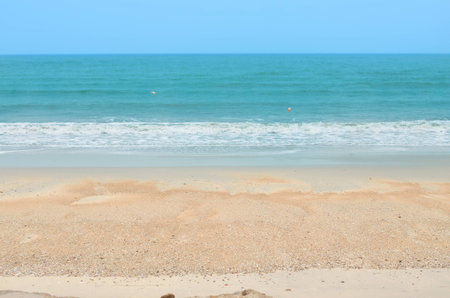 Soft wave with bubble of Blue Ocean on white sand at tropical beach on summer season. Simple beach background for summer. Bubble blue wave from sea to sand on the beach. Summer background.