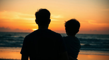Father and son enjoying a beautiful sunset over the ocean, creating a heartwarming silhouette of family bonding. Ai generated image