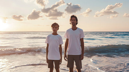 a young father and his son, both wearing white t-shirts, stand together on the serene shore of the sea or ocean, offering a blank canvas for t-shirt design print mock-up templates