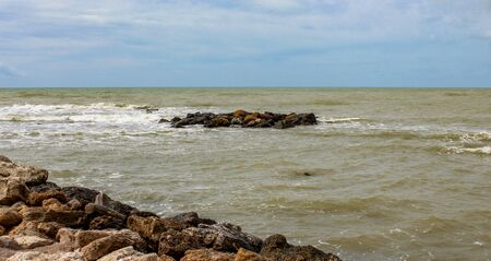 rough and murky sea on a rainy winter day. Cloudy blue sky.