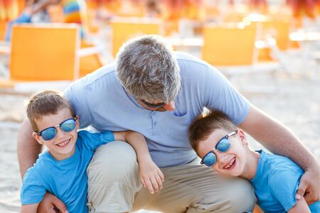 Happy family. Father and his two sons having fun on the beach. Positive human emotions, feelings.