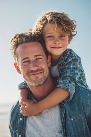 A cheerful father and child enjoy a sunny day outdoors, their faces illuminated by sunlight. The joyful lifestyle portrait features a clear blue sky in the background.