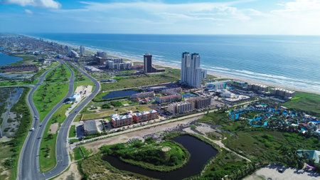 Large waterpark near Isla Blanca Beach in resort town South Padre Island, tropical white sandy beaches with high-rise condos, beach-front hotels, vacation rentals, coastal lagoons, aerial view. USA