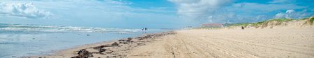 Panorama view large amount of sargassum seaweed along remote white sandy shoreline of South Padre Island with people walking to jetty and oceanfront beach condo, resort, hotel, Gulf Coast barrier. USA