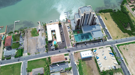 Vacant land near high-rise beach condos, apartment buildings, mansion houses, vacation rentals with swimming pools, tennis court along Laguna Bay of tropical South Padre Island, Texas, aerial. USA