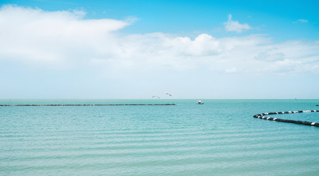 Sea and blue sky with white clouds. Beautiful nature background. Panorama.