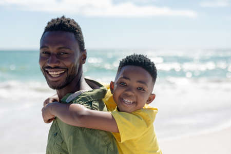 Portrait of happy african american man giving piggyback to son at beach on sunny day. unaltered, family, lifestyle, togetherness, enjoyment and holiday concept.