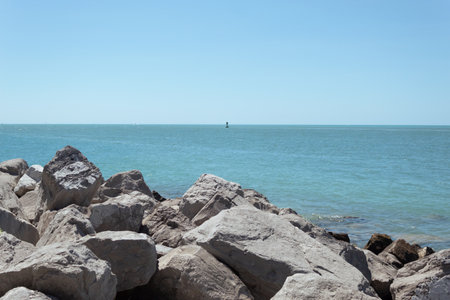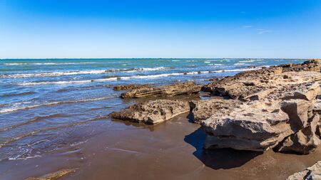 Scenery seascape ocean coastline, amazing panoramic sea shore beach landscape. Travel vacation background. Beautiful day near Adriatic coast, Rimini, Italy