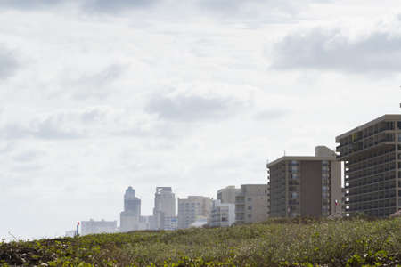 Panorama view large amount of sargassum seaweed along remote white sandy shoreline of South Padre Island with people walking to jetty and oceanfront beach condo, resort, hotel, Gulf Coast barrier. USA