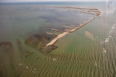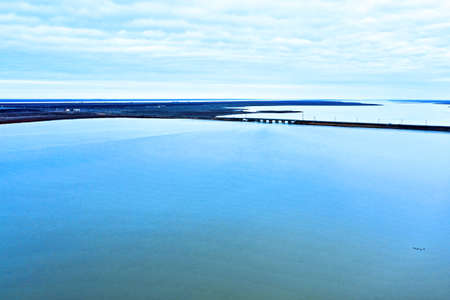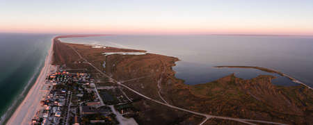 Aerial view of a sunrise over Byriuchyi Island - spit between Azov Sea and Utljuk Lyman , Azov-sivash national park, Kherson Oblast, Ukraine