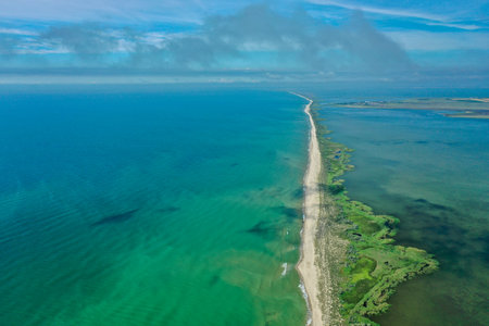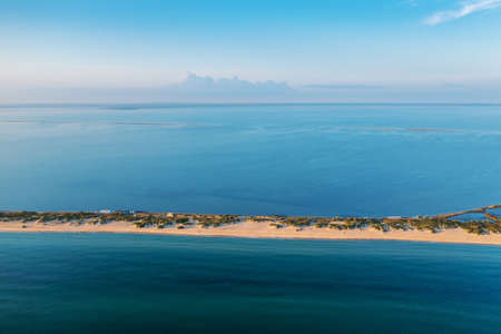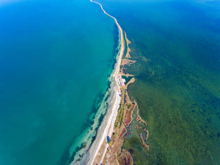 Long spit with beautiful sandy beach between sea and liman, aerial view from drone.