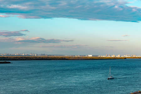 Sea and blue sky with white clouds. Beautiful nature background. Panorama.