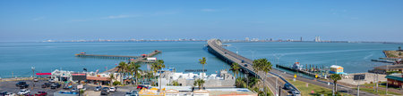 Port Isabel, Texas, USA - November 19, 2019: Aerial view of South Padre Island, across the Laguna Madre, from Port Isabel