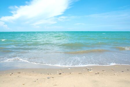 Beautiful tropical beach sand and sea with blue sky background at Hua-Hin District, Thailand