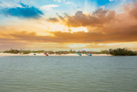 Natural panorama landscape view on beautiful Holbox island sandbank and beach with waves turquoise water and blue sky in Quintana Roo Mexico.