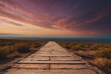 Deserted wooden boardwalk leading away through coastal dunes vegetation towards a glowing cloudy sunset sky in a moody evening landscape on Amrum, North Frisian Islands, Schleswig-Holstein, Germany