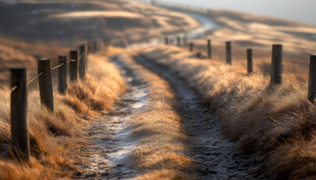 Beautiful view on the hill path with wooden fence or hedge