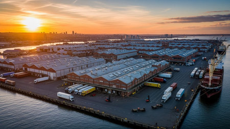 An expansive aerial view of an industrial port city at sunrise. The sky is painted with soft pastel hues of orange and pink, with wispy clouds stretching across the horizon. Tall shipping cranes stand as silent sentinels over the bustling port. Several sailboats glide gracefully on the calm, reflective water, adding a touch of tranquility to the industrial scene. Modern buildings and infrastructure are visible along the waterfront, hinting at the city's economic activity. The morning light...