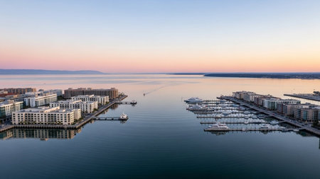 An aerial view of a modern marina at sunrise. The pastel colors of the dawn sky create a soft and tranquil atmosphere, reflected on the still water. Sleek yachts and boats are docked along the piers, adjacent to contemporary apartment buildings. The scene conveys a sense of peaceful luxury and modern coastal living. The vast expanse of the water stretches to the horizon, with distant landmasses visible.