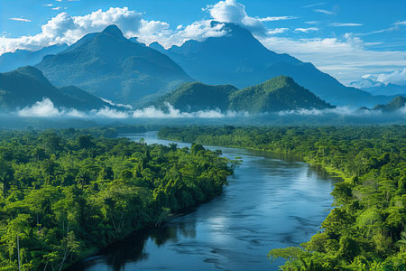 Panoramic photo of the amazon rainforest and mountains, shot from above with blue sky and white clouds, river flowing through the forest
