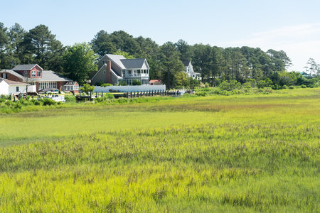 Chincoteague, landscape with houses on the shore! at the entrance to the island. A popular tourist destination on the East Coast.