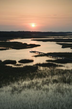 Aerial view of pier in coastal wetland on Bald Head Island, North Carolina.