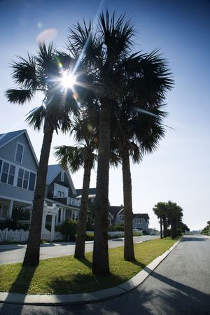 Houses on palm tree lined street on Bald Head Island, North Carolina.