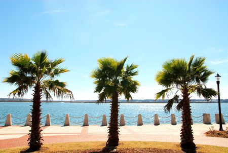Three palm trees on the ocean side of a boardwalk.