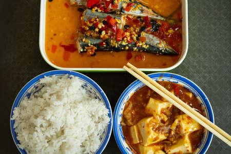 top view of spicy fish and tofu with pork
