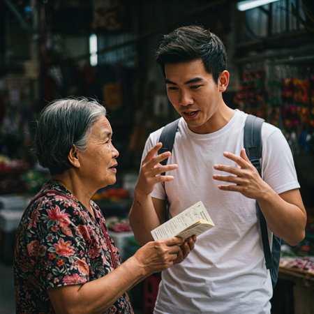 An elderly woman explains the way to a tourist in an Asian market