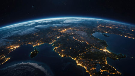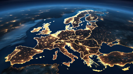 This image shows a nighttime view of Europe from space, with the lights of major cities illuminating the continent. The image captures the dense population centers and urban development throughout the region, highlighting the human footprint on the planet.