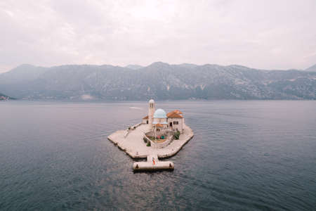 Bride and groom stand on the island near chapel Our Lady of the Rocks, Montenegro. Aerial view