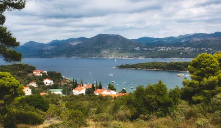 Beautiful Mediterranean seascape with houses tiled roofs on the background of mountains on a sunny day. Italian seascape concept. Traveling by ship