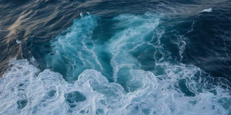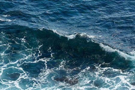 Deep blue ocean water with swirling waves and splashes. Top view of vibrant seascape with sea water