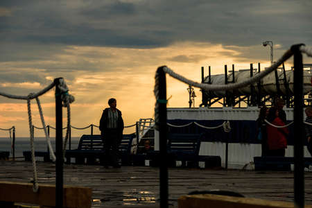 SOLOVKI, REPUBLIC OF KARELIA, RUSSIA - AUGUST 18, 2018: A man walks on a pier during sunset.