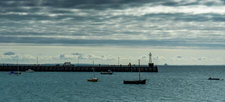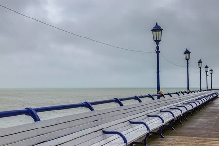 Old pier and atmospheric stormy sea with a rich blue color of water and clouds. Minimalistic storm landscape