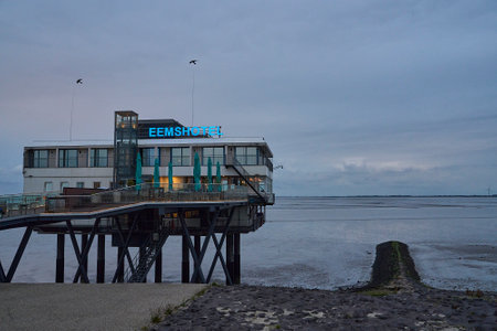 Delfzijl, Netherlands - 07 16 2022: Hotel on stilts on a dike along the river Ems in Delfzijl in the Netherlands at the coast of North Sea
