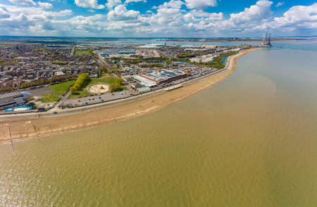 Aerial view of the Southend Pier, a major landmark in Southend-on-Sea and the longest pleasure pier in the world