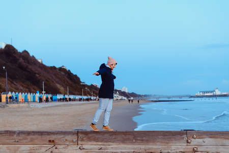 Woman in warm clothes practicing balance and enjoying the moment and sea view during a walk on the coast. Relax and personal fulfillment. Travel in autumn, winter. Selective focus. copy space.