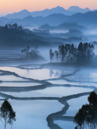Misty Morning Rice Terraces Serene Landscape Peaceful Blue Mountains Tranquil Asian Scenery